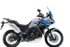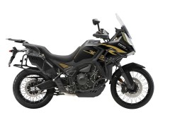 Standardowe wyposażenie obejmuje regulowane zawieszenie Marzocchi, opony Michelin, przednią i tylną kamerę, reflektory przeciwmgielne, bumper, osłonę silnika oraz fabryczne stelaże pod kufry.